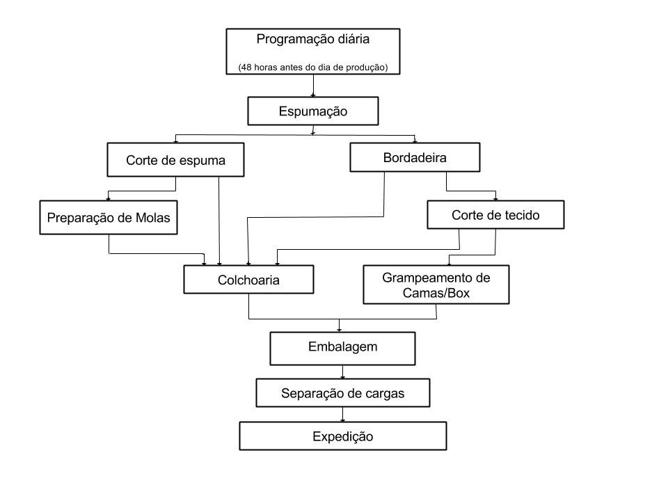 O processo fabril conta com 11 setores que senguem a determinada sequência de roteiro (figura 2): programação, espumação, corte de espuma, corte de tecido, bordadeira, preparação de mola, grampeamento de camas/box, colchoaria, embalagem, separação e expedição.